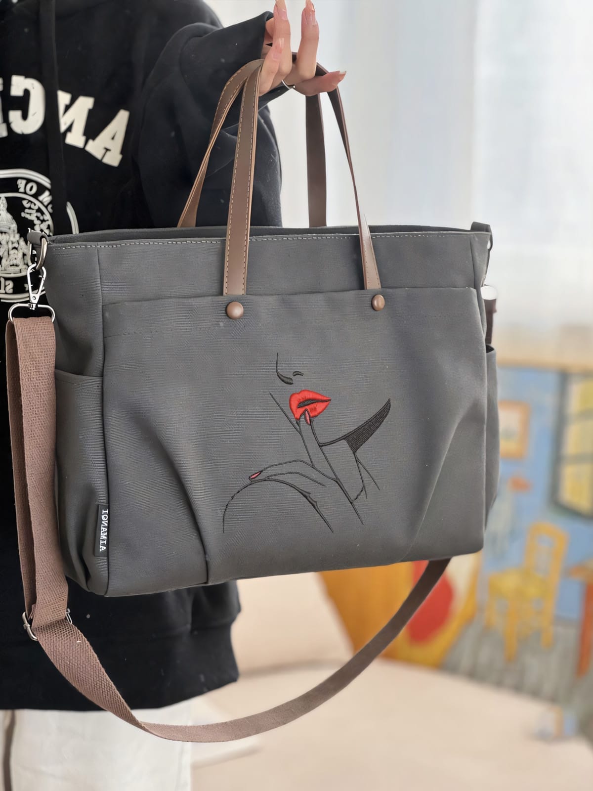 ![]() | A chic, tan shoulder bag with a minimalist design, making it versatile for various outfits Embroidered a stylish illustration of a woman’s face,vibrant sexy red lips, emphasizing confidence and glamour. This bag perfectly combines fashion and function, ideal for those who appreciate elegance in their everyday style,perfect for events, parties, or everyday wear, making a statement wherever worn. | ![]() |