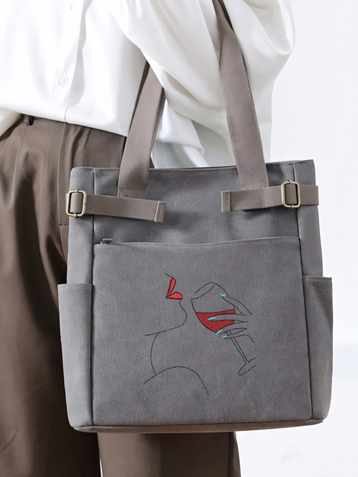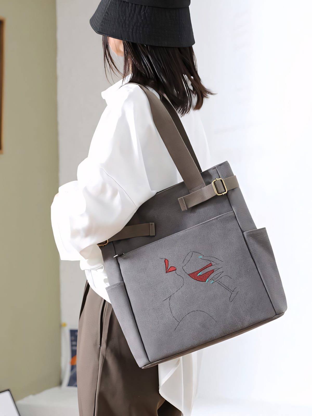Discover our Shoulder Tote Bag, featuring exquisite embroidery of modern women in a one-line art design against an elegant wine hue. This stunning accessory is not only practical but also a stylish statement. Here are some expert styling tips to help you make the most of this unique bag