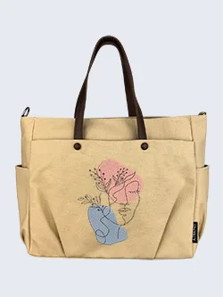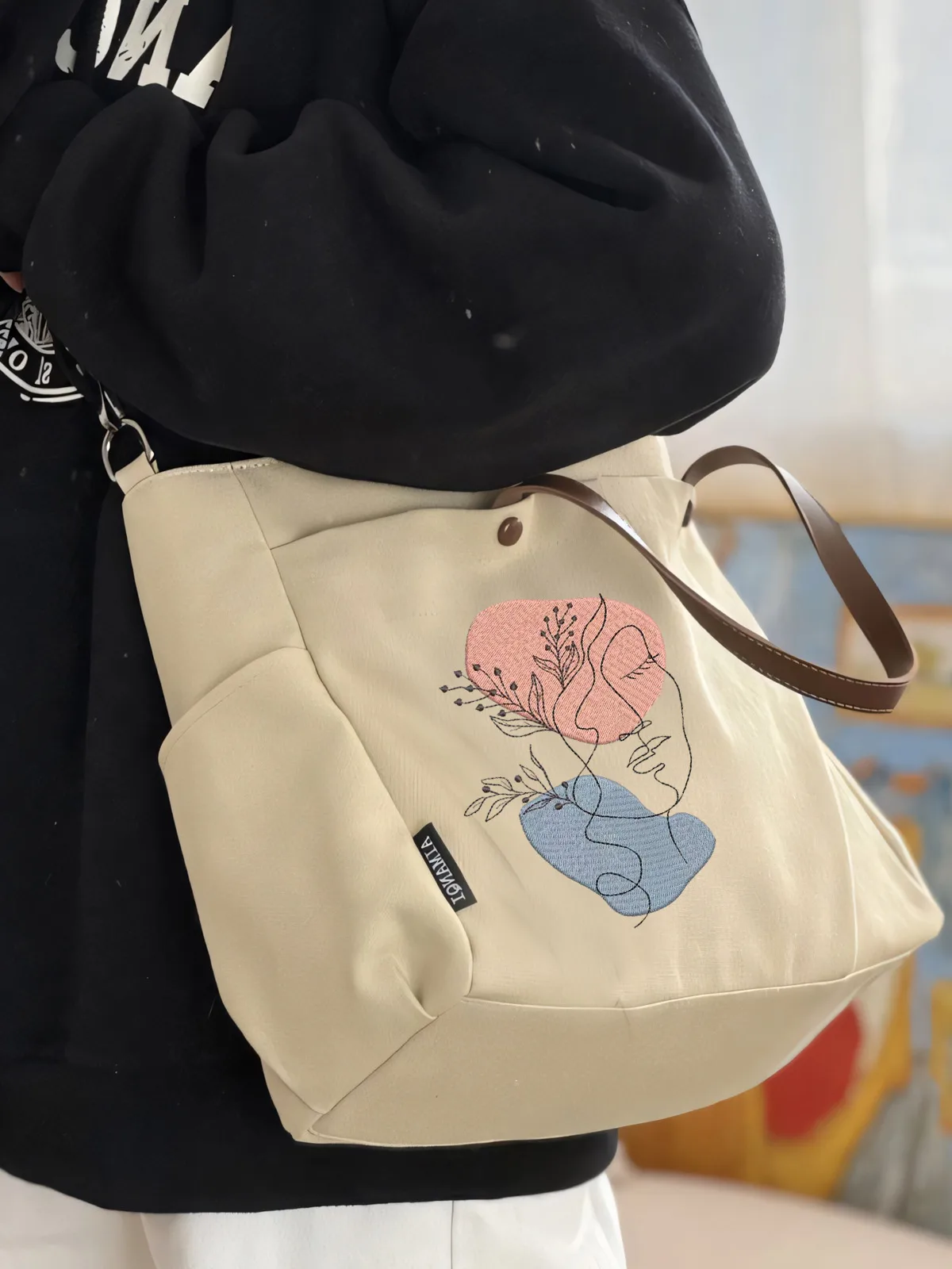 | highlighted by a striking embroidered illustration of a face intertwined with abstract shapes. | This elegant tote bag features a soft beige canvas design The artwork includes soft pink and gentle blue forms, complemented by delicate floral elements, creating a modern and artistic aesthetic. Delicate line drawings of leaves and floral elements intertwine with elegant curves, creating a harmonious and modern aesthetic. The combination of colors and intricate details adds a whimsical touch, making this piece bag perfect for fashion items that celebrate creativity and nature. Its unique style captures a sense of tranquility and artistic flair. | ![]() |
