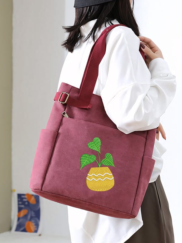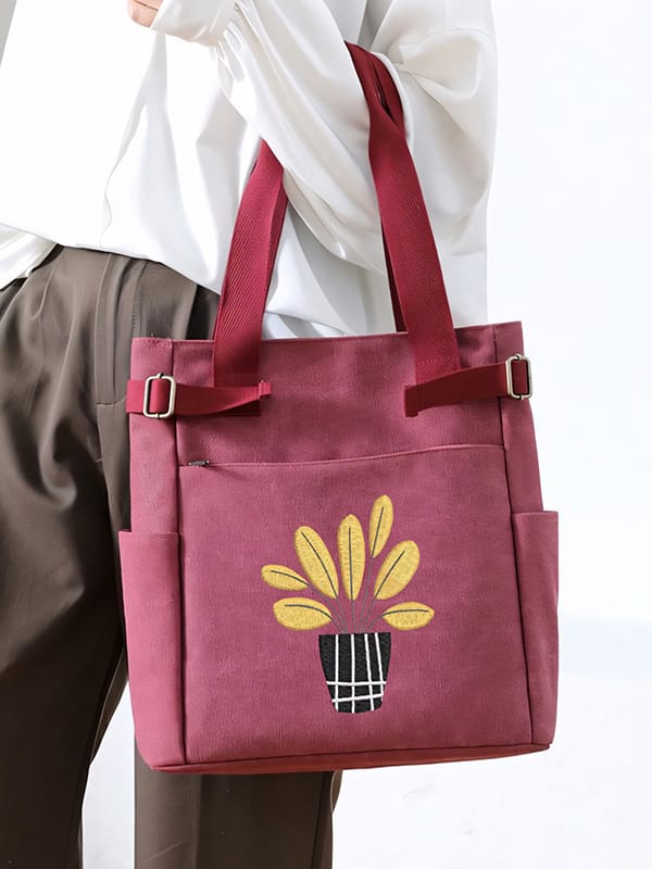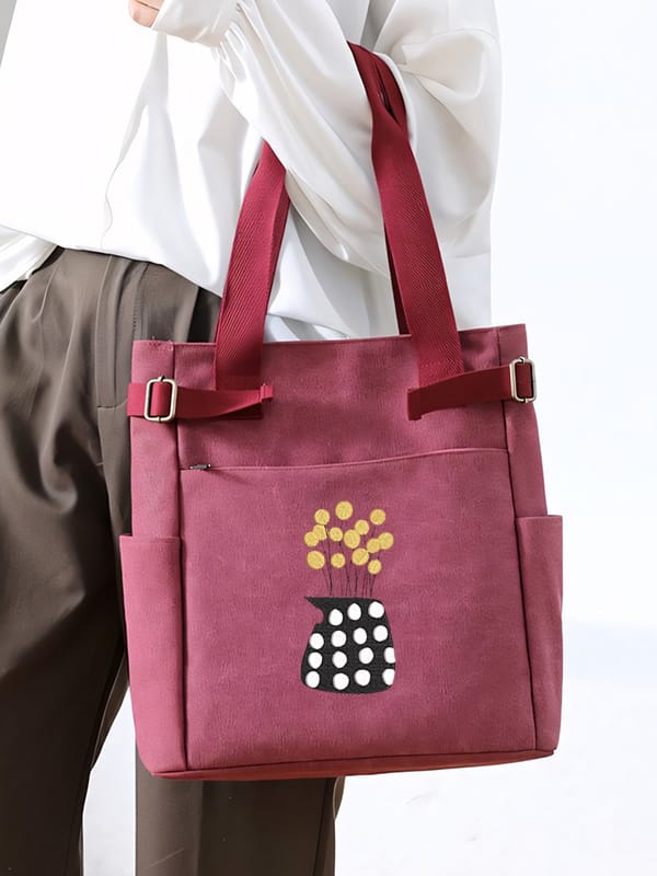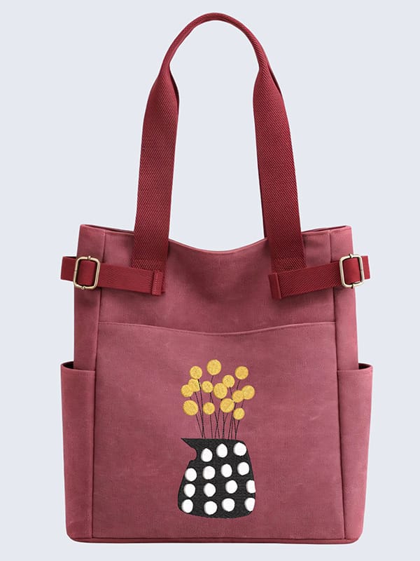 | minimalist style boho black potted plant | This embroidered shoulder bag features a minimalist boho style design. The embroidered vase is black with large white polka dots, creating a striking contrast. Inside the vase are several round yellow flowers or buds on thin black stems, adding a cheerful touch, while providing a stylish and understated backdrop. It showcases an elegant embroidery of a potted plant, adding a touch of nature-inspired charm to the bag. The plant's simple lines and shapes reflect a modern aesthetic while maintaining a relaxed bohemian vibe. This combination of design elements makes the bag perfect for casual outings, effortlessly blending functionality with artistic flair. | ![]() |