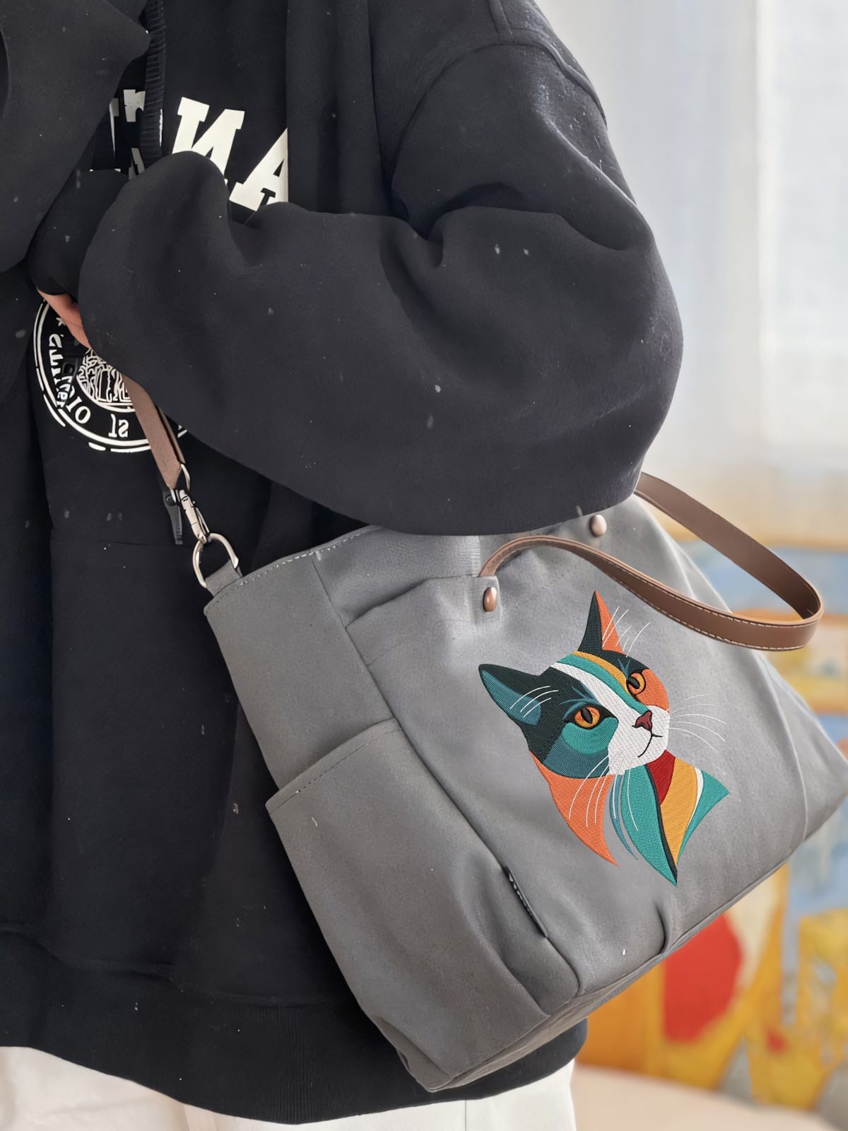 The grey tote bag is more than just an accessory; it’s a celebration of creativity in the form of a fashion-forward cat bag