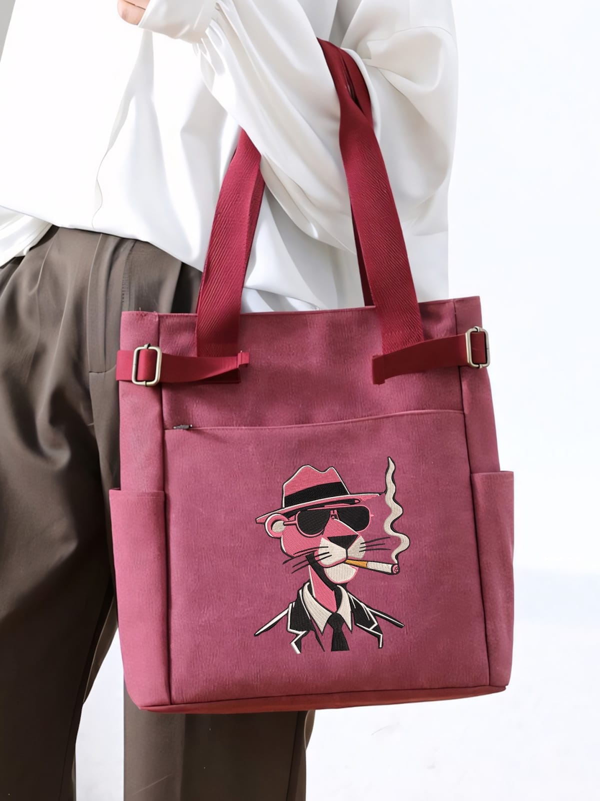 | Pink Panther with arms crossed and stylish sunglasses | This meticulously crafted bag features the Pink Panther with arms crossed and stylish sunglasses. Whether you’re a devoted Pink Panther fan or simply looking to express your style, this embroidered bag is a fantastic way to showcase your personality. Add a touch of fun to your wardrobe or outings and celebrate this beloved character with confidence! | ![]() |